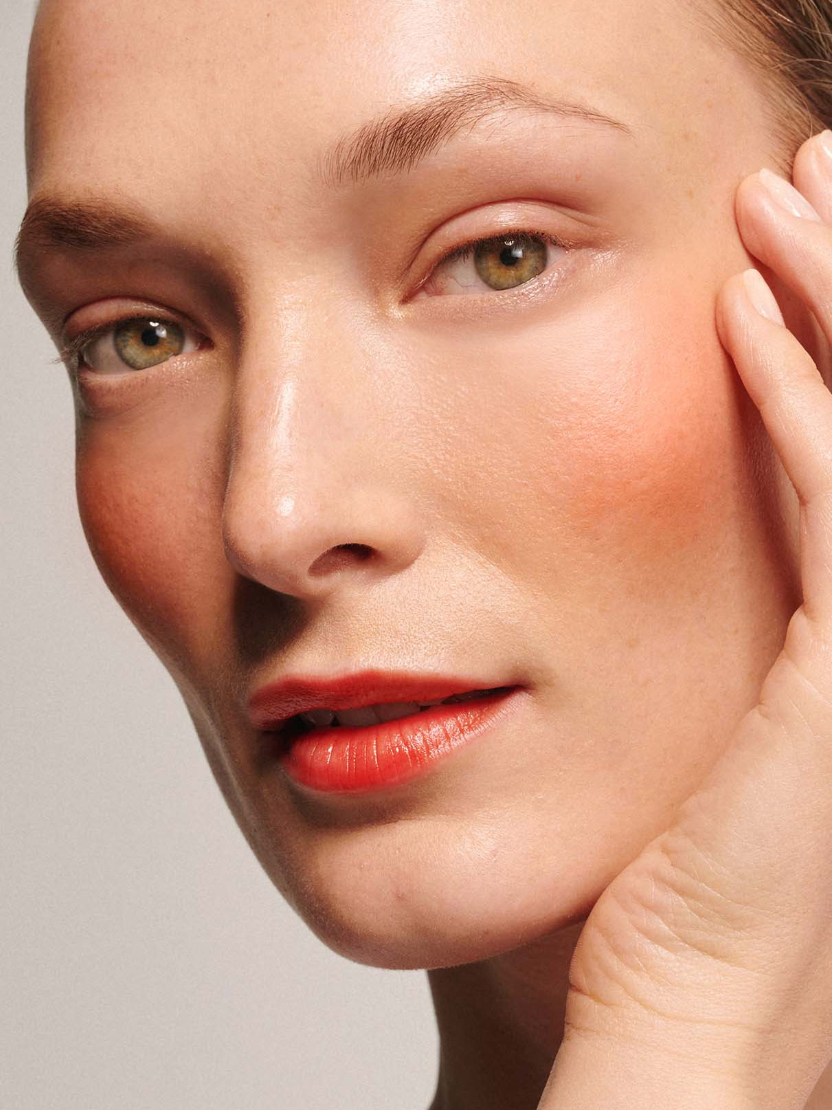 Marlene is wearing All Glow Highlighter, Lip Glaze no. 01, Infinite Lash Mascara, Brow Control and plant-based nail colour no. 103.