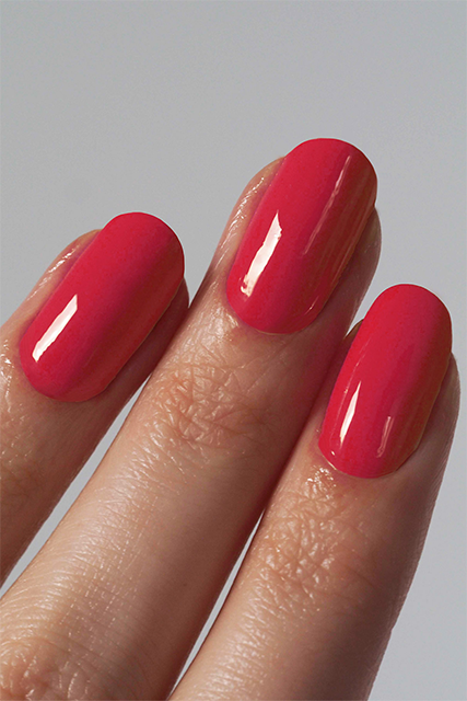 This is NOT Red at all! It’s a pinky coral color. But it’s LOVELY and the nail polish goes on smooth and dries quickly. Also there is no strong smell. Great polish. Highly recommend. Will definitely be purchasing some more colors!
